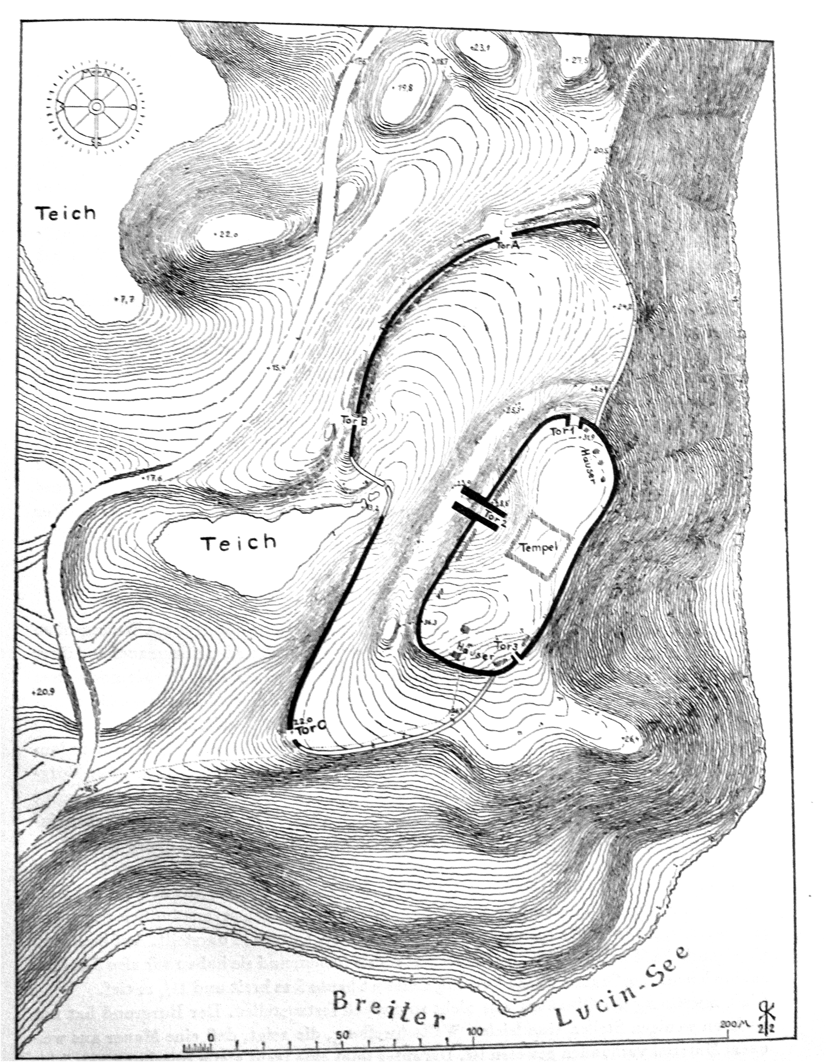 Um die Tempelburg von Rethra wiederzufinden, haben wir nun also nicht mehr nach einem dreizipfligen Gelände zu suchen, sondern nach einem slawischen Ringwall, der die Möglichkeit für drei Tore bieten muß. Als weitere Kennzeichen kommen nach Thietmar in Betracht ein schreckhafter See im Osten, und im Rücken, also westlich ringsumher, ein großer dichter Wald.