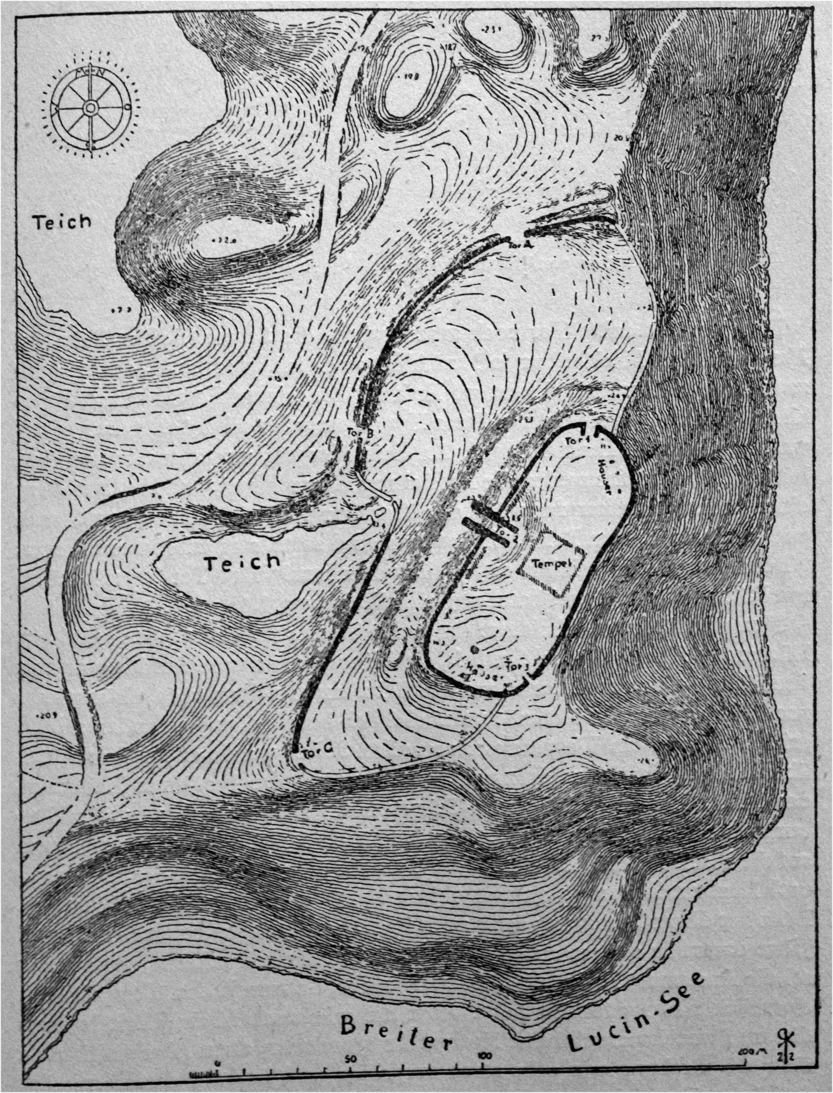 Nun war Rethra wohl sicher: das große Wasser im Osten, der Urwald im Rücken, die Tempelstelle deutlich, drei Tore, von denen das kleinste zum See führte, – was wollte man mehr?! Beltz erzählte denn auch, als er wieder nach Hause kam, wie Rethra nun tatsächlich bei Feldberg gefunden sei. Da griff er aber in ein Wespennest: von allen Seiten wurde er mit Vorwürfen überschüttet, daß er ruhig zugesehen habe, wie das berühmte Heiligtum, das bisher immer Mecklenburg-Schwerinisch gewesen sei, nun Mecklenbur-Strelitzisch werden solle. Man hatte sich damals in der Tat allgemein auf die Fischerinsel im Südzipfel der Tollense geeinigt, sodaß die Schweriner und Neubrandenburger sich in ihrem Besitz sehr sicher fühlen konnten. Beltz hat dieser Stimmung dann auch Rechnung getragen, indem er ein paar Jahre darauf in seinem Artikel für Eberts Reallexikon erklärte, ganz sicher sei die Ansetzung Rethras bei Feldberg nicht, da man ja den Tempel selbst eigentlich nicht gefunden habe. Aber die wissenschaftliche Welt hat von diesem Zweifelsversuch keine Notiz mehr genommen, mein Akademiebericht über die Grabung war sehr rasch vergriffen und ist bald darauf mit den Aufsätzen über Arkona und Vineta zusammen als Buch erschienen1.