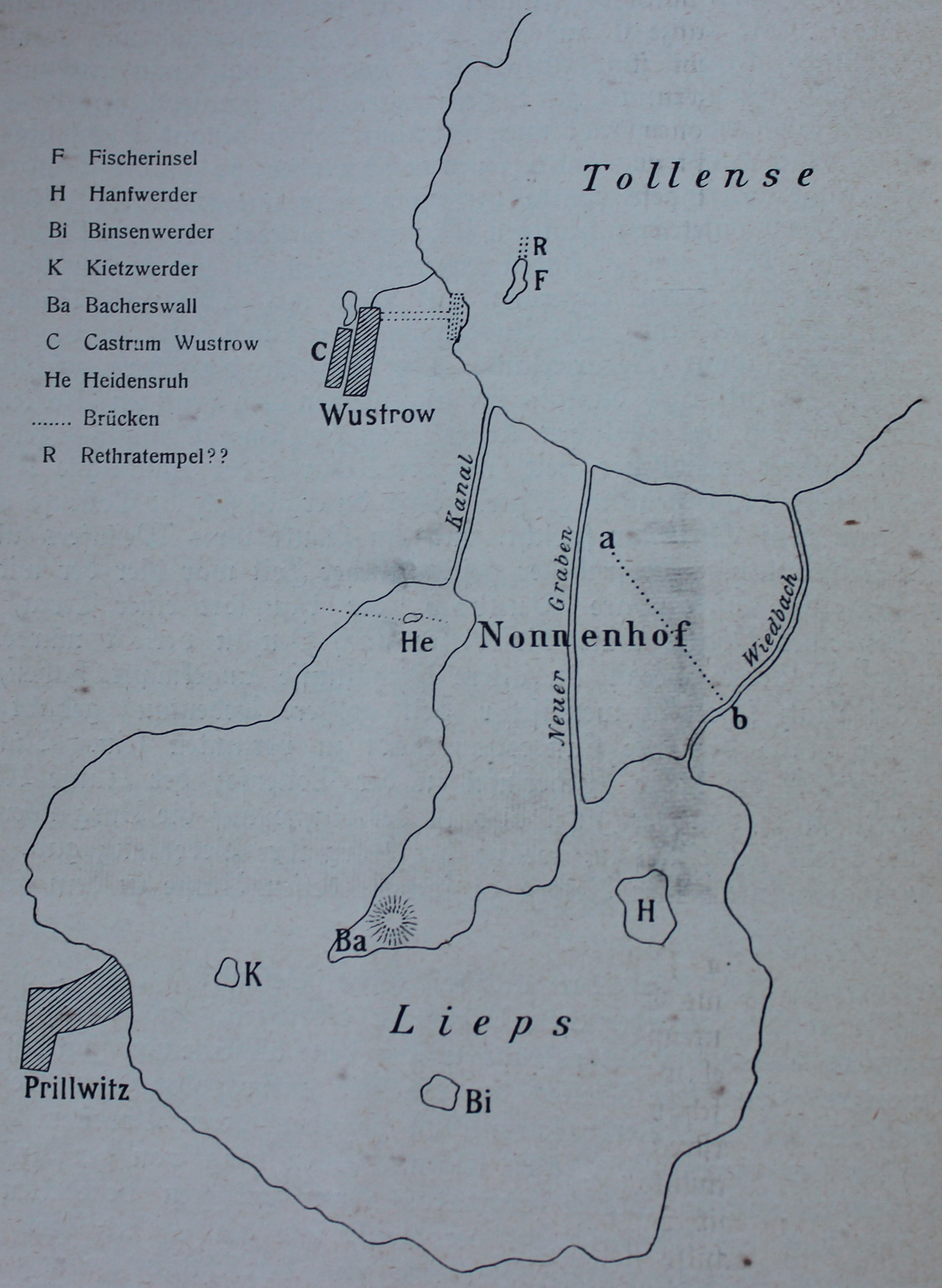 In Prillwitz sind keine wendischen Reste gefunden; diese Stelle hat also vorläufig auszuscheiden. Dagegen haben sich die Inseln und Halbinseln der Lieps als sehr stark besiedelt erwiesen. Hanfwerder und Bacherswall sind wendische Burgwälle oder doch geschützte Wohnstätten; die anliegenden Teile der Niederung des Nonnenhofs, Kietzwerder und Heidensruh sind mit den allbekannten und unverkennbaren Überbleibseln, welche die wendische Besiedelung überall hinterläßt, besonders den leicht zu bestimmenden Scherben, durchsetzt. Sodann ist auf dem festen Boden an der Tollense die Lage des mittelalterlichen Castrum Wustrow an der Stelle des jetzigen Hofes erkennbar; am Abhange zum See liegen wendische Scherben massenweise. Dort führt eine lange, wohlgefügte Brücke in diesen hinein, welche auf die (alte) Südseite der Fischerinsel weist; diese Brücke verbreitert sich nahe ihrem Ende an einer Stelle nach beiden Seiten und hat hier ein größeres Bauwerk getragen. Eine zweite Brücke muß nach Pfahlresten am Nordende der Lieps über die Insel Heidensruh in das besiedelte Gebiet des Nonnenhofes geführt haben.