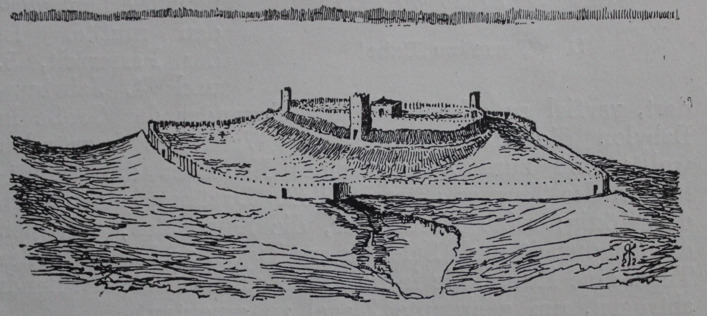 Robert Koldewey hat die hier wiedergegebene Ansicht aus der Vogelschau gezeichnet, um die Wirkung der dreihörnigen Burg vor der großen Wasserfläche darzustellen. Es ist seine letzte Zeichnung gewesen. Nachher hat er die Feder nicht mehr angerührt[1].
